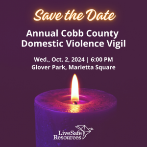 Join LiveSafe Resources at the Cobb County Domestic Violence Vigil on October 2, 2024, at 6:00 pm at Glover Park in Marietta Square.