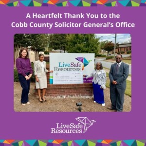 On October 25, 2024, the Cobb County Solicitor General Sneaker Ball took place, and we are incredibly grateful to Cobb County Solicitor General’s Office and Solicitor General Makia Metzger for their unwavering support. We are honored to have been named the event beneficiary and receive a generous donation of $18,000 to support our mission at LiveSafe Resources. This contribution allows us to continue our work in providing safety, healing, and support to victims of domestic violence and sexual assault. We appreciate the attention this brings to the ongoing need for awareness and action in our community. Together, we can make a lasting difference in the lives of those who need it most.