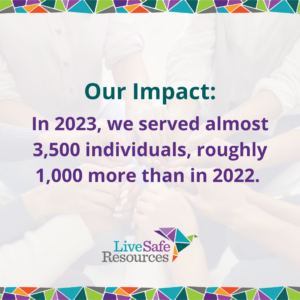 In 2023, LiveSafe Resources proudly served almost 3,500 individuals, which is roughly 1,000 more than the previous year, 2022.