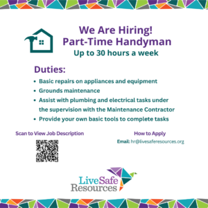 Looking for a rewarding part-time position? We’re hiring a handyman to join our team, assisting the LiveSafe Resources Maintenance Contractor with basic repair and maintenance tasks for up to 30 hours per week.